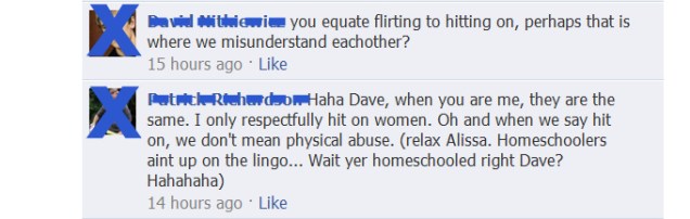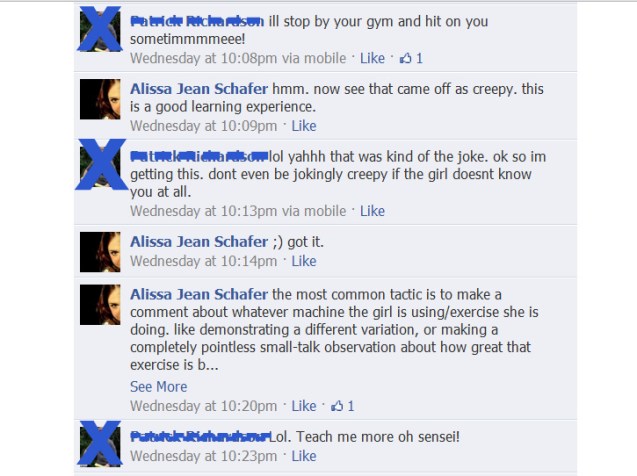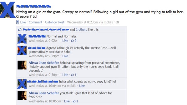 {in case you can’t read the full original status, it is:  “Hitting on a girl at the gym.  Creepy or normal?  Following a girl out of the gym and trying to talk to her. Creepier? Lol”